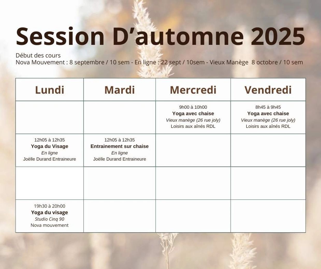 Voici notre horaire d'automne pour les cours en présentiel et en synchrone (en ligne). Nouveauté au programme : le yoga du visage :).